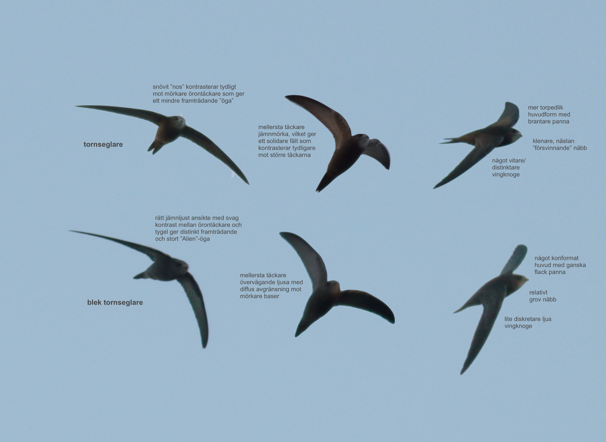 Artsbestemmelsen blev lidt af en omgang frem og tilbage. Jeg var overbevist om, at det var en Gråsejler, men tvivlen sneg sig ind, da kommentatorer på Facebook og i Messenger tænkte Mursejler. Til sidst kiggede jeg billeder igennem på kameraets skærm og det fik mig selv overbevist om, at det måtte være en sen Mursejler og derfor sendte jeg en dementi ud på Bird Alarm. Hjemme sent om aftenen fik jeg dog tid til at se billeder på computeren og nu var det igen en Gråsejler. Derfor sendte jeg billeder til Hans Larsson for at få han vurdering, da han i den grad har flyttet hjørneflagene for bestemmelse af de to arter. Hans har været så venlig og lave en collage, hvor han fremhæver de karakterer, der er afgørende for bestemmelsen til Gråsejler. Samtidig har han sendt to andre collager med, der på pædagogisk vis illustrerer begge arter, idet de i Sverige for nogle uger siden havde en Mursejler og en Gråsejler, der fouragered sammen. Da jeg fik åbnet min mail, havde jeg også modtaget en grundig kommentar fra Thomas W. Johansen, hvor han ligeledes fremhæver, hvorfor det er en Gråsejler vurderet alene ud fra de billeder jeg havde vedhæftet mine meldinger i Bird Alarm.