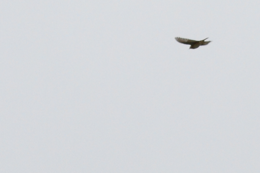Klokken 09.47 stod jeg i genboens have med kamera over skylderen og kikkert i hånden, da jeg hørte en Storpiber kalde. Det blæste endnu ikke ret meget, så kaldet gik rent igennem. Da fuglen sekundet efter kom henover et læhegn, så jeg fuglen komme trækkende ret lavt i dybt bølgende flugt. Igennem håndkikkerten kunne jeg bekræfte, at det var en stor piber. Herefter greb jeg efter kameraet og inden jeg nåede få det slået over på videofunktion og fik begyndt at optage, kaldte den ydereligere to gange. De næste par sekunder kaldte den ikke, så jeg slog video fra og begyndte i stedet at tage nogle billeder for at have en eller anden form for dokumentation. Den fortsatte på ruten lavt henover Friland, hvor den kaldte endnu en gang imens jeg tog billeder. Da den nåede ud over den høstede mark syd for Friland, slog den om (det ene billede, hvor den tipper til siden med strakte vinger) og det så ud til at den tabte højde. Desværre forsvandt den ned bag et træ og jeg kunne ikke afgøre om den gik ned på marken eller fortsatte. Jeg satsede på det første og gik straks derover med hunden i håb om at kunne få den på vingerne og få en optagelse af kaldet, men den var tilsyneladende ikke gået ned eller så var den hurtigt trukket videre, for den kunne ikke trædes op.